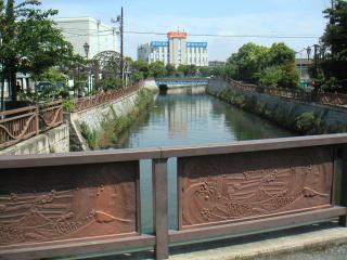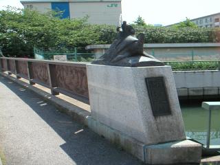 河川改修に伴い、こんなモニュメントをあしらった橋が12個あって、川沿いにウォーキングロードが整備されているのです。気持ちよく散策できます。