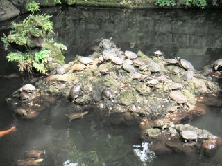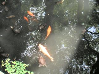 間に池があり、そこにかかる石橋を渡るのですが、池には大きな鯉が泳いでいました。