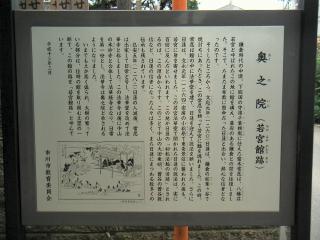 奥の院は、本院から徒歩、5分くらいの距離にあります。中山法華経寺は、日蓮聖人を保護し、帰依した千葉氏に帰属する若宮の領主富木常忍(ときじょうにん)と、中山の領主大田乗明(おおたじょうみょう)の子日高(にちこう)とが、共に館の内部に堂を建て、それぞれ寺院として法華経寺、本妙寺と称したのですが、のちに合体して一つの寺となり、法華経寺と号するようになったものです。富木常忍は、日蓮聖人の入滅後出家して日常(にちじょう)と号し、法華経寺はこの日常上人を開山にしているのですが、その日常上人の館の跡地がこの奥の院です。
