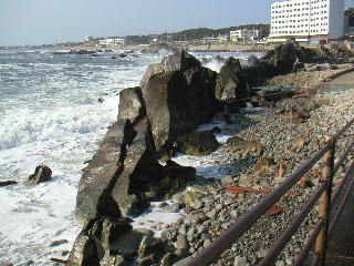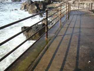 波しぶきが歩道を濡らしています。
